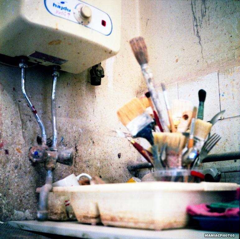 Geöffnet wird der Lichtschacht durch einen kleinen Hebel rückseitig. Intuitiv will man ihn nach unten drücken; Erfolg hat man aber nur durch ein Schieben nach rechts 😉 Durch das Suchen für Infos zu dieser Kamera habe ich erst festgestellt, dass bei meiner Flexaret II die Vergrößerung über der Mattscheibe fehlt. Was erklären könnte, dass ich mir bei der Schärfe oft unsicher war und viel Zeit zum Justieren brauchte… Hat trotzdem geklappt 😉 Okay… Hier bei den schlechten Lichtverhältnissen eher weniger. Ich wollte die Pinsel scharf haben… Aber hätte ich Euch das nicht gebeichtet, wäre das Foto vielleicht auch so durchgegangen 😉